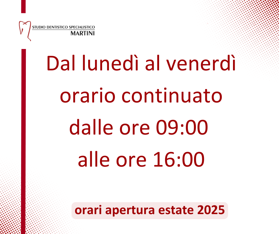 Siamo lieti di comunicarvi che, per tutto il periodo estivo fino all'8 settembre, il nostro studio resterà aperto con orario continuato dalle 9:00 alle 16:00, dal lunedì al venerdì.